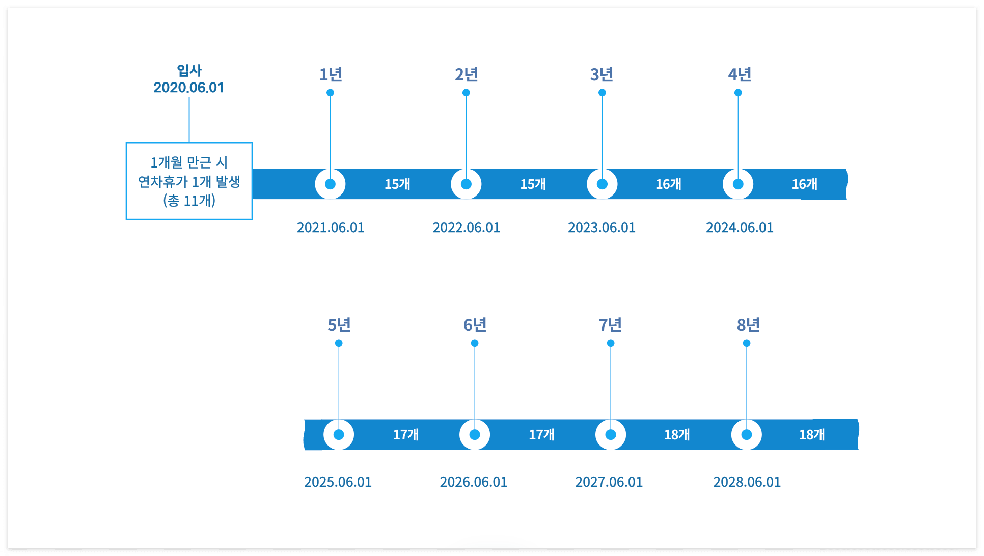 • 입사 후 7년 이상~: 17일 + 1일(추가) = 18일의 연차휴가 발생.