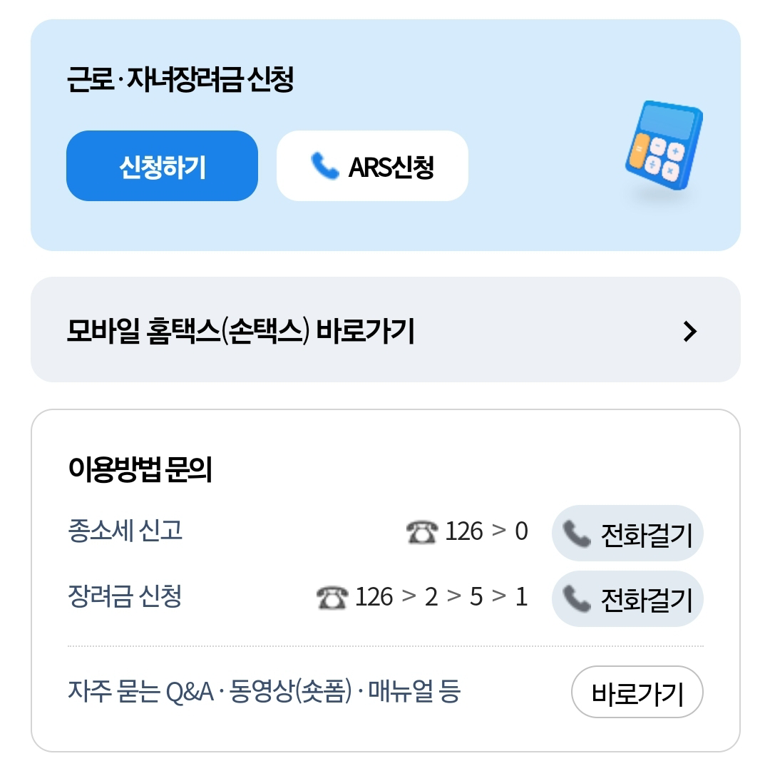 - 온라인 신청: 국세청 홈택스 웹사이트를 통해 온라인으로 신청할 수 있습니다. 홈택스에 로그인 후, 근로장려금 신청 메뉴에서 신청하실 수 있습니다. (☞근로장녀금 신청 자격 확인 바로가기)