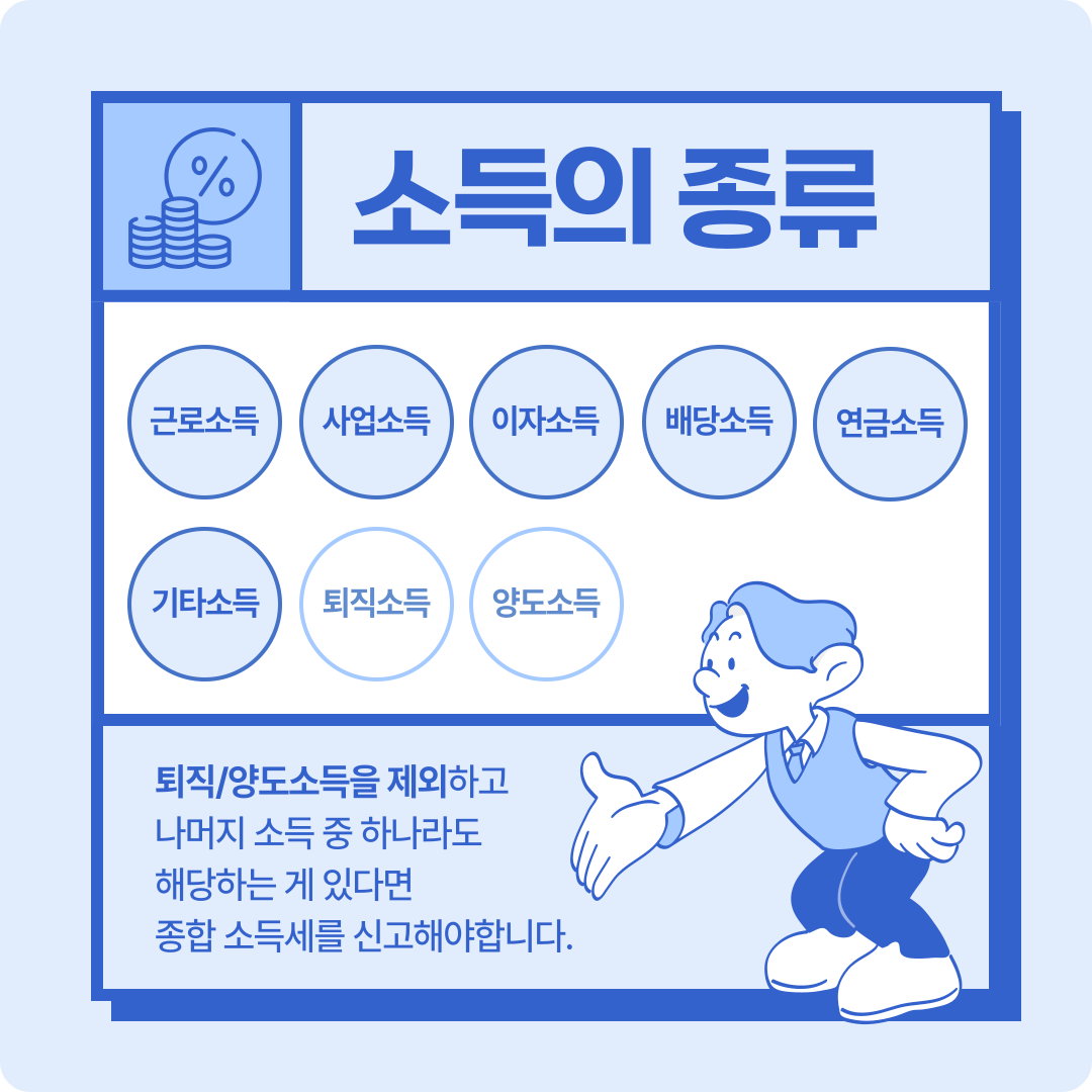 - 근로소득: 직장에서 받는 급여 외에도 연말정산을 통해 정산하지 않은 소득.
