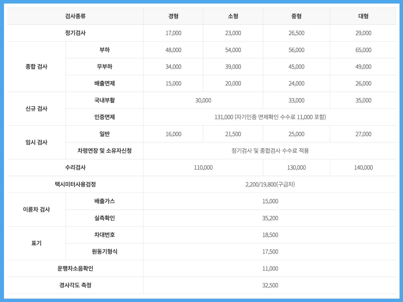 자동차검사 수수료는 아래표를 참고해주세요.