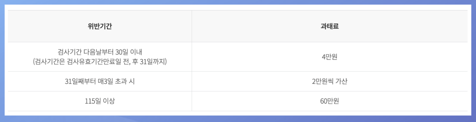 자동차 검사를 기한 내에 받지 않을 경우, 검사 유효 기간이 지난날로부터 60만 원 이하의 과태료가 부과됩니다. 과태료는 검사 기한 초과 일수에 따라 증가하며, 차량의 용도와 종류에 따라 기본 과태료가 다를 수 있습니다.